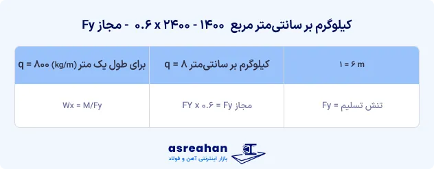 همچنین میزان باری که بر هر طبقه وارد میشود حدود ۸۰۰ کیلوگرم بر مترمربع در نظر گرفته میشود. به بیان دیگر، بار مؤثر بر هر متر طول سقف تقریباً همین مقدار است. بر همین اساس، محاسبه با استفاده از فرمول زیر انجام میگیرد: